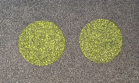 Razavi intertwines images of ordinary objects, icons of popular culture, and real or imaginary signs & symbols to construct narratives, scenes, and stories. His work addresses the personal and collective experiences of social and intimate life. He is best known for his “graffiti-like drawings,” which he began working on four years ago in a sharing studio with artist Fereydoun Omidi. Coming from an advertising background, working on large pieces of such was a natural step for him.